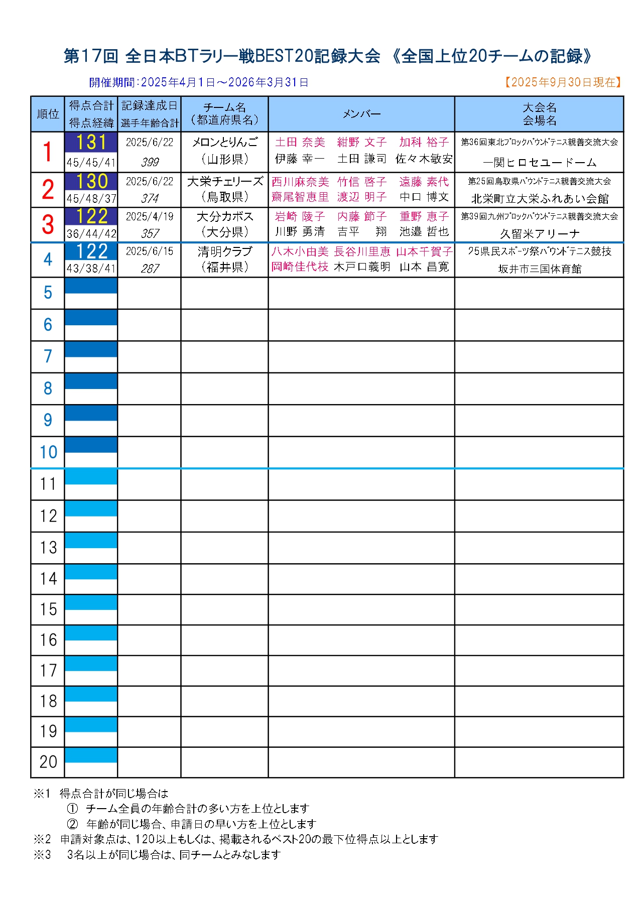 (4)同一チーム(メンバー構成は問わない)が記録の更新申請を行った場合は、ホームページ上は更新された順位(得点)のみが掲載され、それ以前の記録は抹消される。
