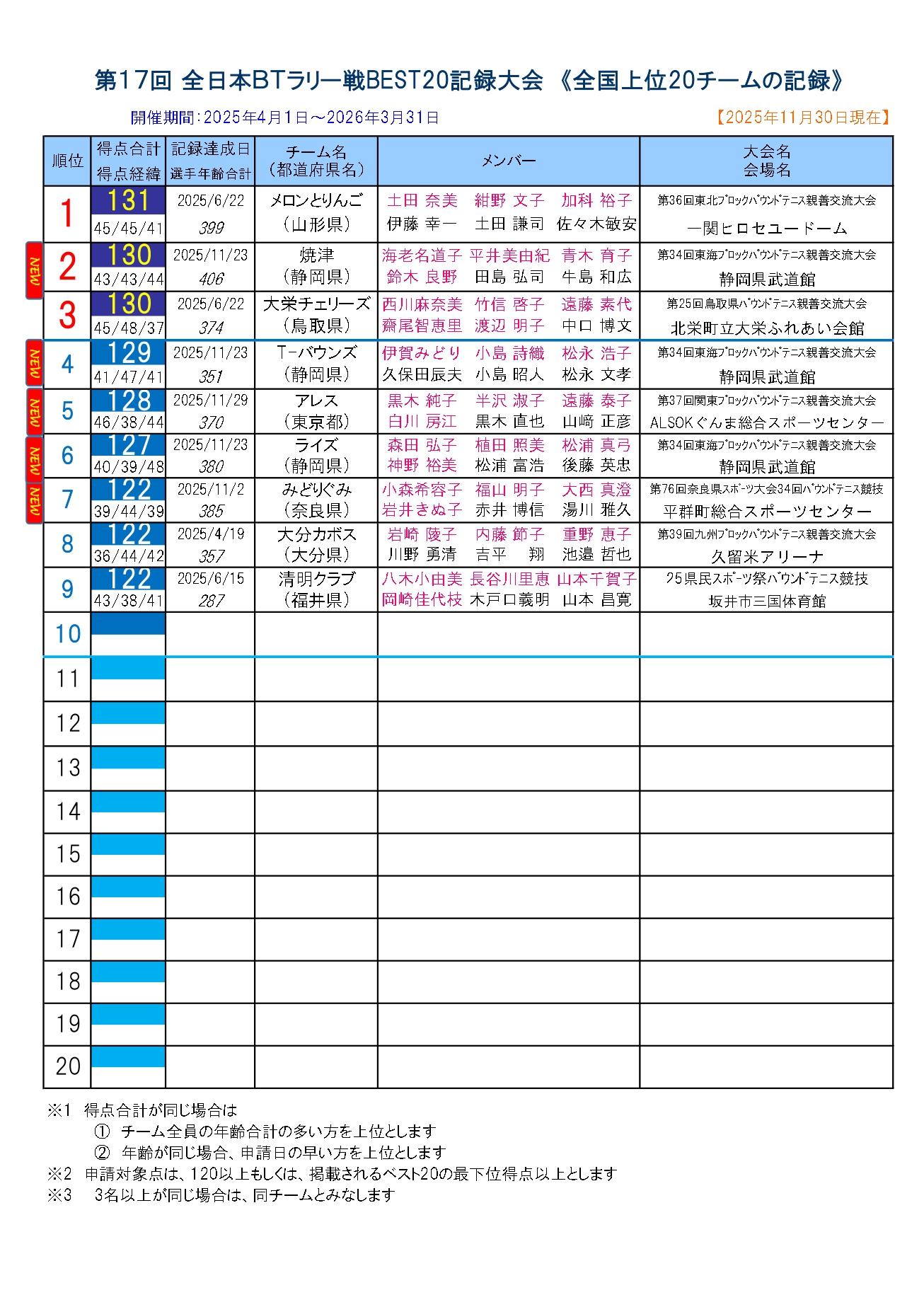 (4)同一チーム(メンバー構成は問わない)が記録の更新申請を行った場合は、ホームページ上は更新された順位(得点)のみが掲載され、それ以前の記録は抹消される。